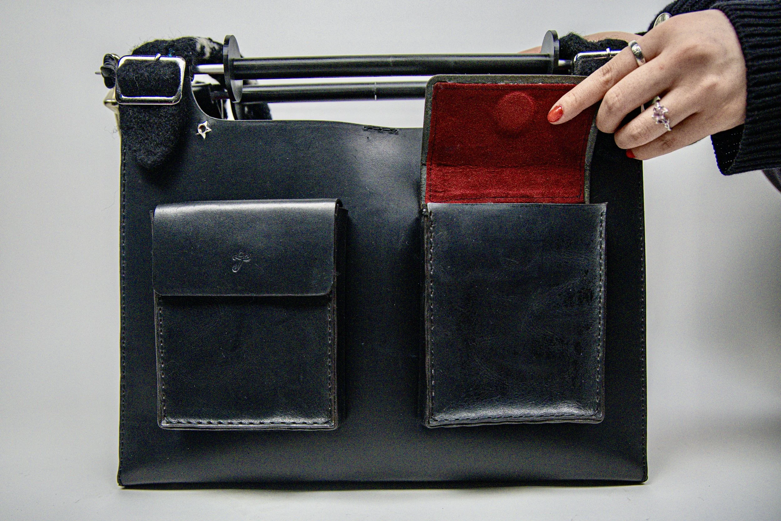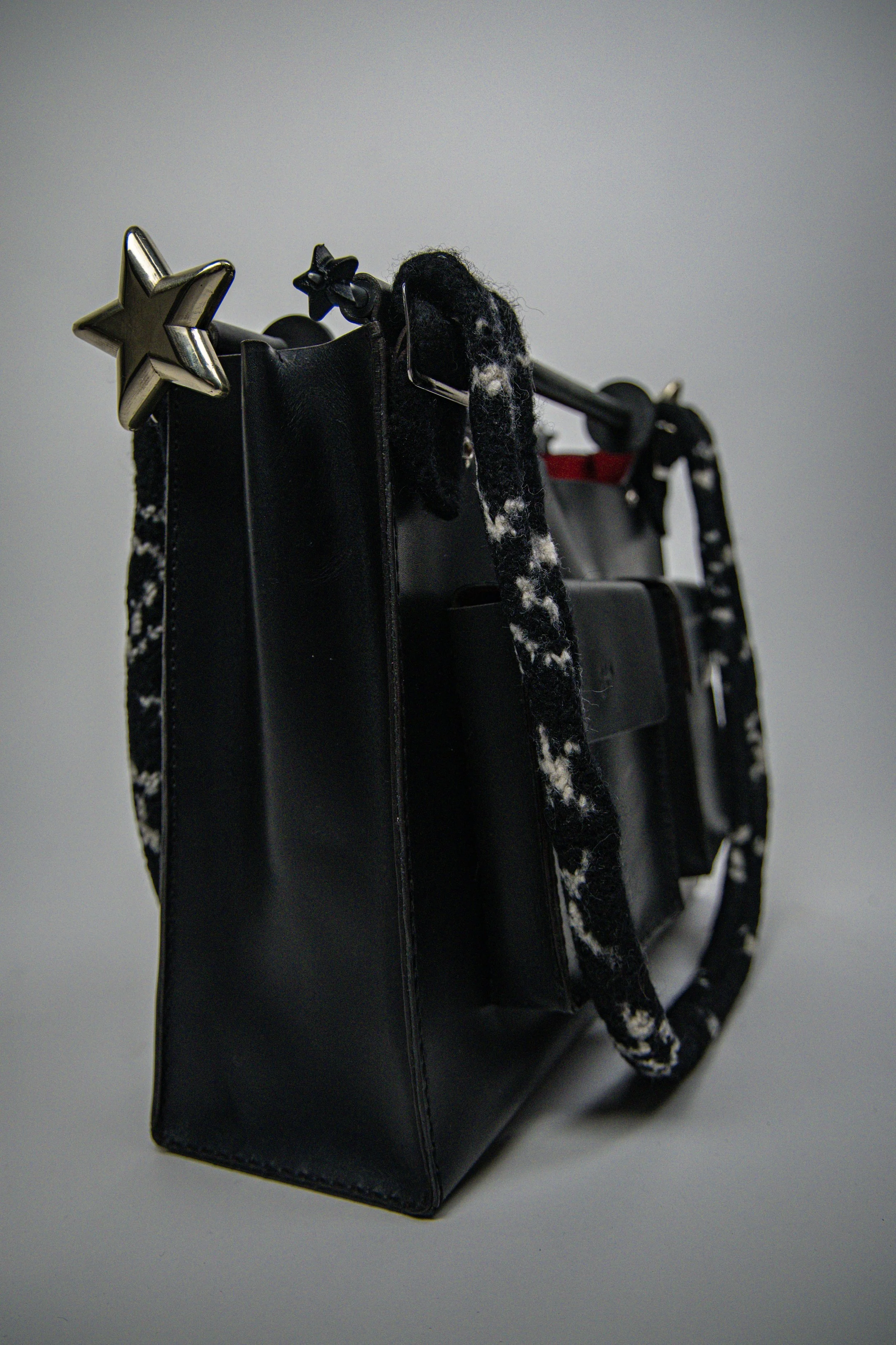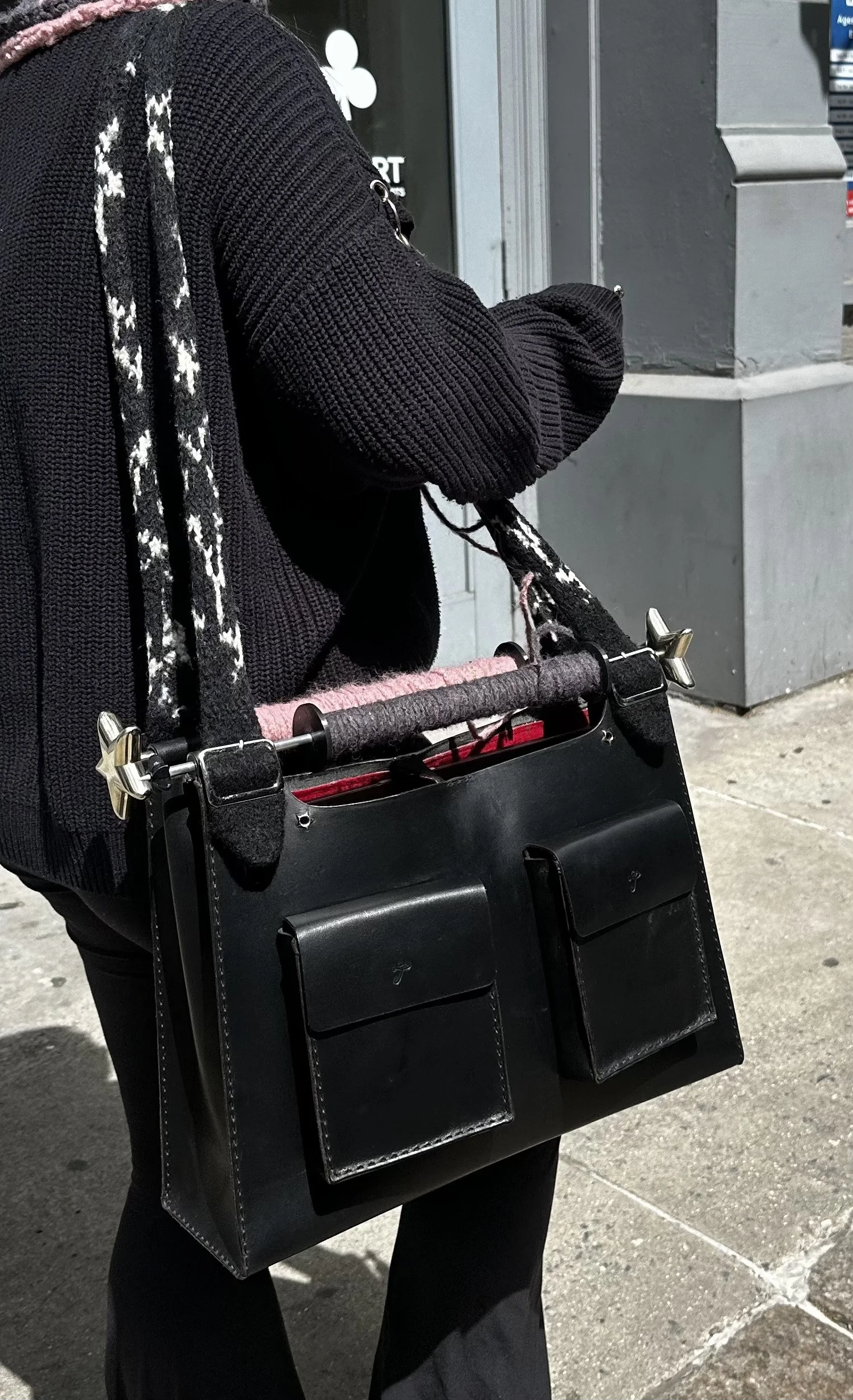 For my capstone project, I was given the freedom to define my own direction—and I chose to channel my passion for fiber arts into reimagining a bag tailored for the modern-day knitter. The result is a bold, functional, and fashion-forward accessory that challenges outdated stereotypes of who a fiber artist can be. This bag features a hand-knit and wet-felted strap for comfort, a zipperless and Velcro-free closure system for seamless access, and integrated tools such as custom-designed knitting needles and bobbins for winding yarn directly on the bag. Built from 100% genuine leather, every piece was meticulously cut, hand-stitched, and crafted from the ground up. Custom white brass star handles not only tie into the “nova” theme but also serve a functional purpose—facilitating the yarn-winding mechanism. Designed for students, travelers, professionals, and creatives alike, this bag reflects the versatility and modernity of today’s fiber artists. It’s not just an accessory—it’s a statement of empowerment, utility, and style.