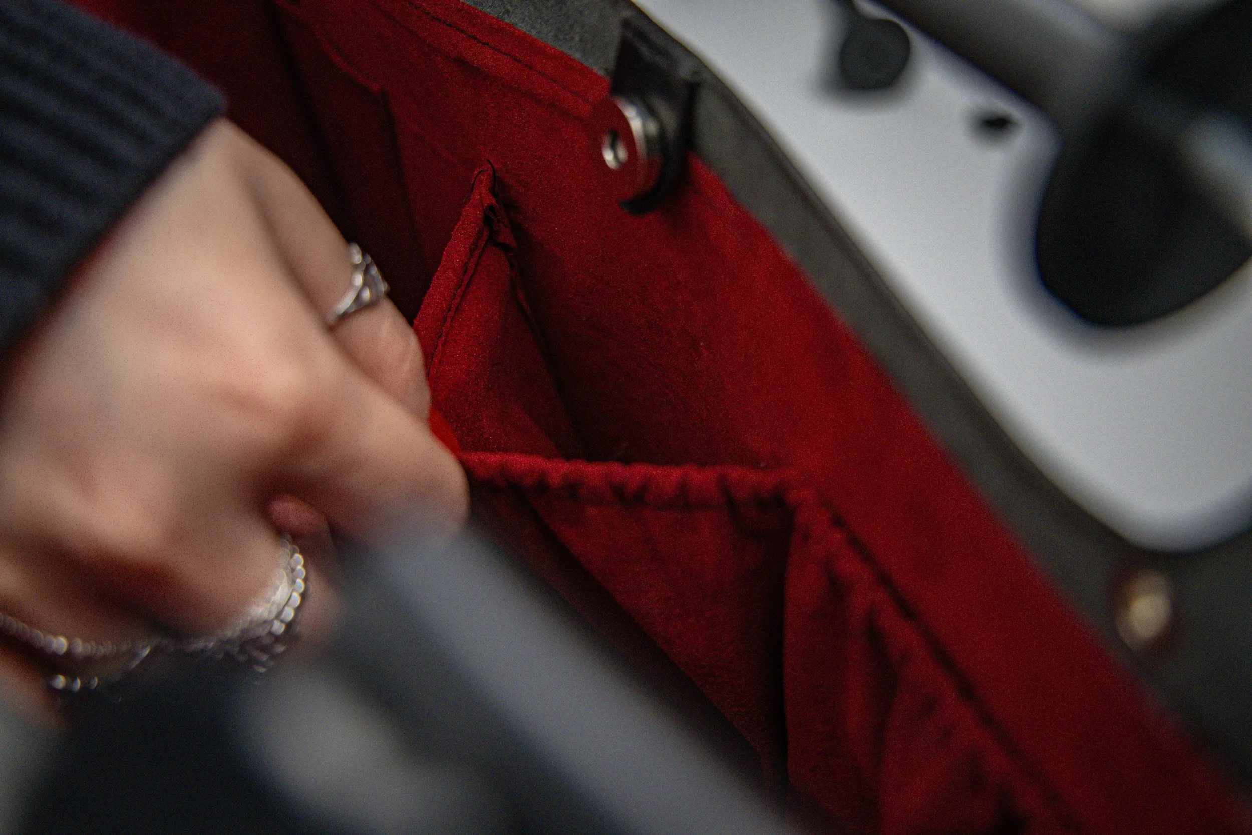 Magnetic cargo pocket | Embossed front pocket flaps | Inner suede stretch pockets | Knitting needle holder